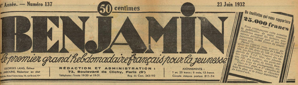 Le premier numéro du journal BENJAMIN parait le 14 novembre 1929. BENJAMIN "Le premier grand hebdomadaire français pour la jeunesse.". Dans le numéro 137 paru le 23 juin 1932 est lancé le "Grand Concours de l'Oncle Précis".