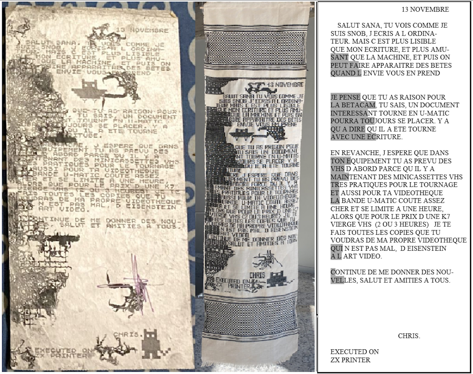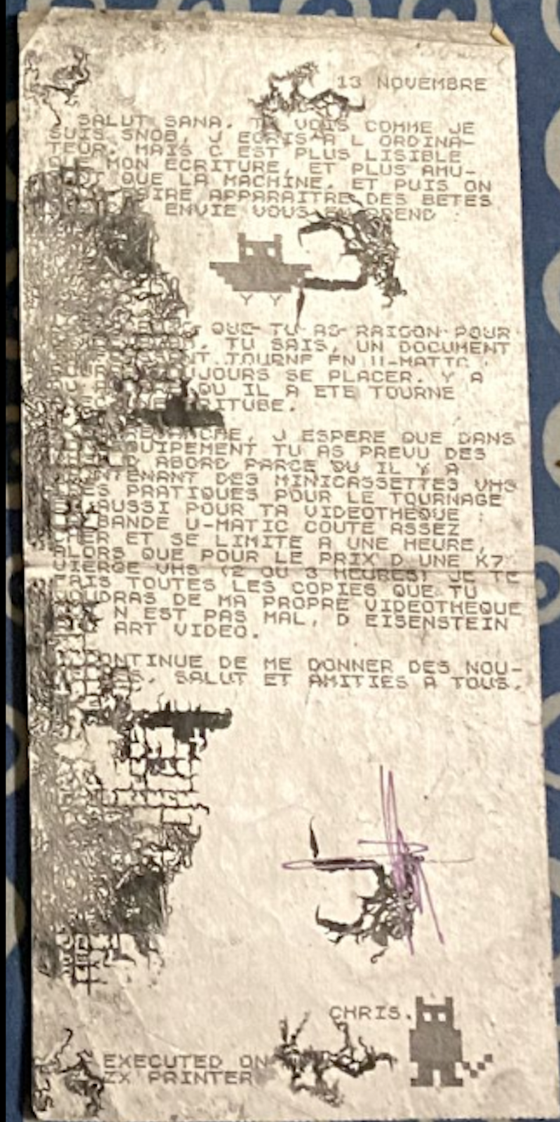 Un 13 novembre du début des années 80, Chris Marker écrit au réalisateur Sana Na N'Hada (Voir également ici), il utilise son ordinateur ZX81, l’imprimante thermique compacte Alphacom 32 fera le reste sur un papier d’aluminium de 10 cm de largeur.