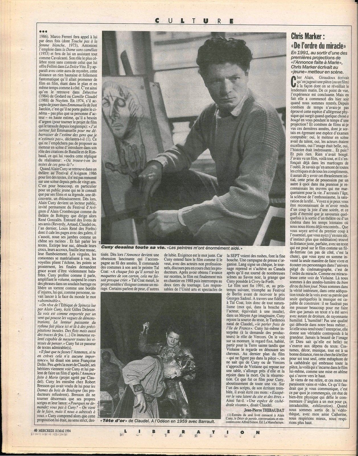 [Lettres de CM à Alain Cuny écrite en 1991] : publiée intégralement sur le site derives.tv et partiellement dans Libération, no 4041 (18 mai 1994), p. 41
