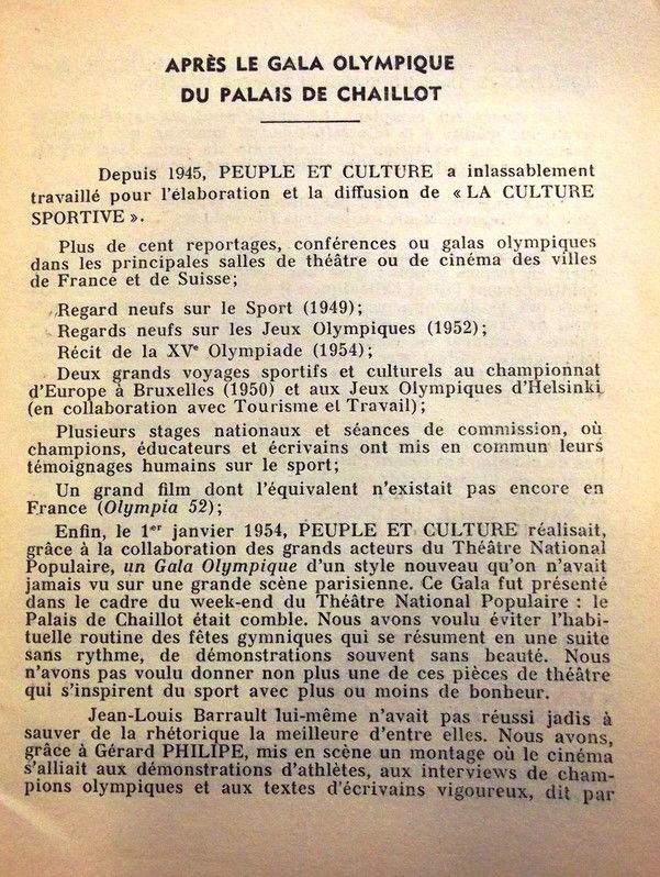 - Peuple et Culture, n° 17 (n.s., 1954), p. [9 (voir aussi les 2 photos ci-dessous, p. 3 et 4, sur le "Gala olympique"] : "Région Basses-Pyrénées. Tournée de Olympia 52 : Du lundi 18 janvier au mercredi 3 février 1954, le film Olympia 52 a été présenté par B. Cacérès, dans le département des Basses-Pyrénées ; il y obtenu un réel succès. Chaque jour, une ou deux matinées scolaires avaient lieu, ainsi qu'une soirée Grand Public. Nous tenons à remercier l'Inspecteur d'Académie, M. l'Inspecteur départementale Jeunesse et Sports, et l'ensemble de ses services pour l'aide qu'ils nous ont apportée. La satisfaction unanime des "scolaires" et du "Grand Public" témoigne de l'intérêt de tous. Il nous a été déjà demandé de nouveaux circuits. Le groupe Peuple et Culture des Basses-Pyrénées, premier département à avoir organisé un circuit Olympia 52, doit être fier des résultats. Le temps exécrable : tempête de vent, pluie, froid le plus rigoureux connu sur la côte depuis longtemps, et enfin les routes enneigées, n'ont pas empêché un nombreux public de se déplacer. À tous, et en particulier aux organisateurs qui avaient à faire face à de multiples difficultés pratiques, PEC adresse ses plus sincères remerciements. Le film a été présenté du lundi 18 janvier au mercredi 3 février 1954 dans les localités suivantes : Salies-du-Béarn, Pau, Monein, Oloron-Sainte-Marie, Mauléon, Orthez, Le Boucau, Saint-Jean-de-Luz, Biarritz, Bayonne, Hendaye, Nay. Dans chaque localité, une ou parfois deux séances scolaires avaient lieu en matinée, une séance "Grand Public" en soirée."