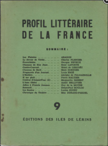 - "Variation sur un Silence (sous le pseudonyme de Marc Dornier)", Profil littéraire de la France, n° 13 (avril 1943), p. 29-31
