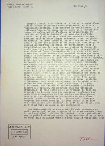 Mon intouchabilité est un mythe. Je suis seulement un petit peu occupé, et pas toujours là où on me cherche. Mais si on s’applique… En tout cas, comme il n’est pas évident que je passe bientôt par Nantes (j’ai traversé la ville deux ou trois fois en allant voir mes amis Demy et Varda dans leur moulin de Noirmoutiers) note mes coordonnées de Paris. D’abord ma nouvelle boîte postale : [...] Ainsi tu n’auras pas d’excuse pour ne pas me voir si toi, tu passes par Paris. Donne-moi aussi tes repères londoniens : Londres est plus souvent sur mon chemin que Nantes.