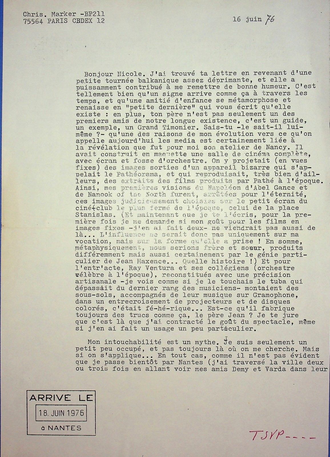 "Bonjour Nicole. J’ai trouvé ta lettre en revenant d’une petite tournée balkanique assez déprimante, et elle a puissamment contribué à me remettre de bonne humeur. C’est tellement bien qu’un signe arrive comme ça à travers les temps, et qu’une amitié d’enfance se métamorphose et renaisse en “petite dernière” qui vous écrit qu’elle existe : en plus, ton père n’est pas seulement un des premiers amis de notre longue existence, c’est un guide, un exemple, un Grand Timonier. Sais-tu -le sait-il lui-même ? – qu’une des raisons de mon évolution vers ce qu’on appelle aujourd’hui les media est certainement liée à la révélation que fut pour moi son atelier de Nancy. Il avait construit en maquette une salle de cinéma complète, avec écran et fosse d’orchestre. On y projetait (en vues fixes) des images sorties d’un appareil bizarre qui s’appelait le Pathéorama, et qui reproduisait, très bien d’ailleurs, des extraits des films produits par Pathé à l’époque. Ainsi, mes premières visions du Napoléon d’Abel Gance et de Nanook of the North furent, ancrées pour l’éternité, ces images judicieusement choisies sur le petit écran du ciné-club le plus fermé de l’époque, celui de la place Stanislas. (Et maintenant que je te l’écris, pour la première fois je me demande si mon goût pour les films en images fixes – j’en ai fait deux – ne viendrait pas aussi de là… L’influence ne serait donc pas uniquement sur ma vocation, mais sur la forme qu’elle a prise ! En somme, métaphysiquement, nous serions frère et sœur, produits différemment mais aussi certainement par le génie particulier de Jean Maxence… Quelle histoire !) Et pour l’entr’acte, Ray Ventura et ses collégiens (orchestre célèbre à l’époque), reconstitués avec une précision artisanale – je vois comme si je le touchais le tuba qui dépassait du dernier rang des musiciens – montaient des sous-sols, accompagnés de leur musique sur Gramophone, dans un entrecroisement de projecteurs et de disques colorés, c’était fé-hé-rique… Est-ce qu’il fabrique toujours des trucs comme ça, le père Jean ? Je te jure que c’est là que j’ai contracté le goût du spectacle, même si j’en ai fait un usage un peu particulier.